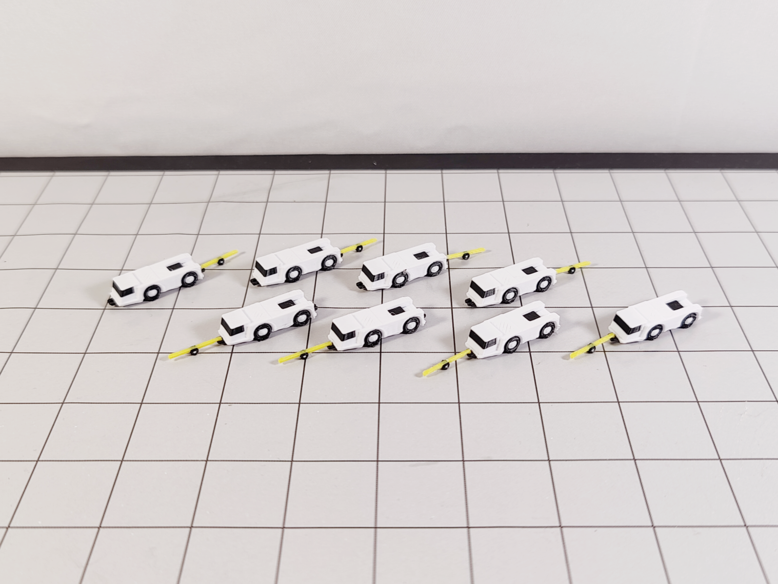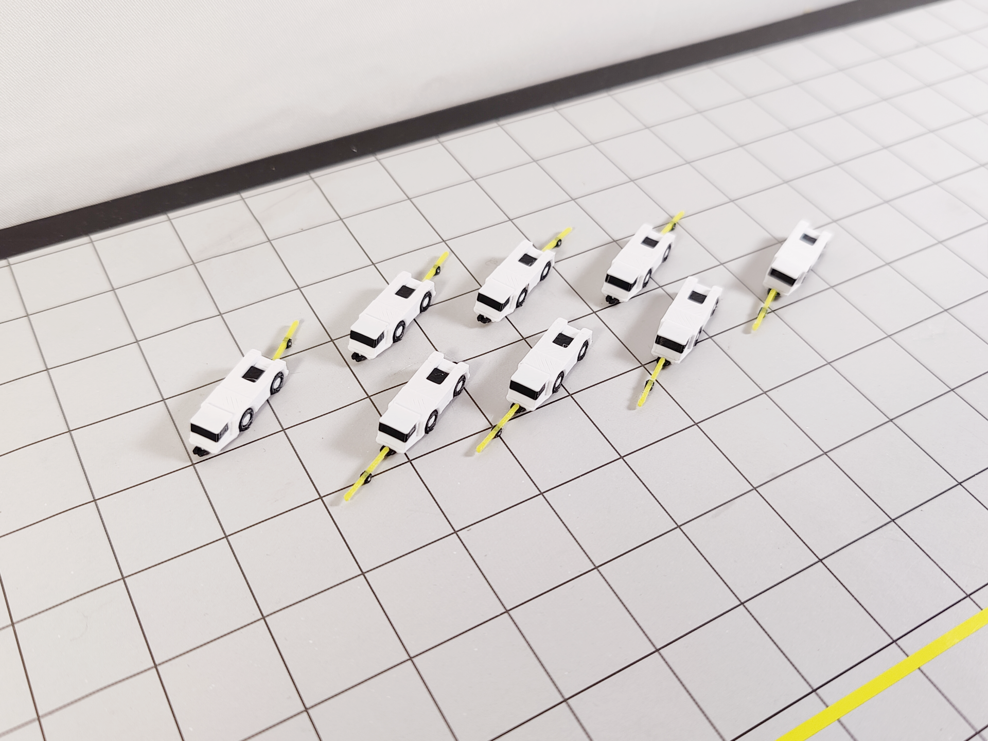 Complete your airport diorama set up with this Set of 8 Aircraft Tugs + Tow Bars